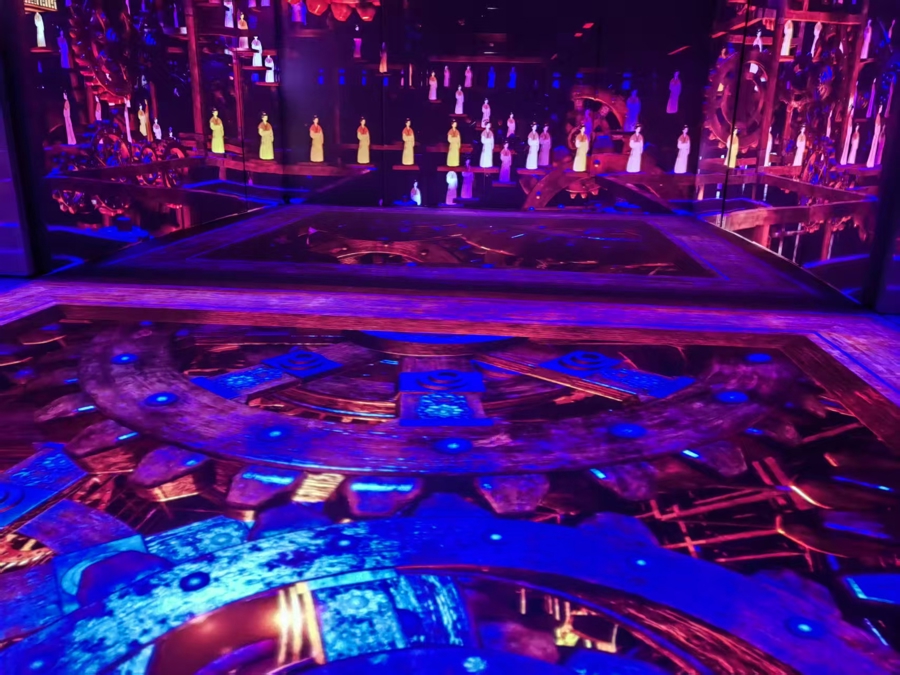 短片结尾,观众可以走入中央观影区,看到眼前、两边都有不同的“结局画面”,有的通往过去,有的通往未来,形成一种看与被看的关系。导演许龙龙介绍,《无界》在形式上通过宏大的画面和声音将观众“包裹”进去,以技术制造沉浸感,内容上却引发“抽离”和思考,迫使观众从纯粹的审美体验中跳出来,转变为一名思考者,“我们不是在灌输知识,而是在邀请观众参与一场思辨,既是与画的对话,也是与前人、与自己、与未来的对话。”