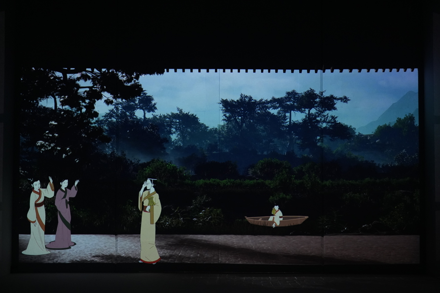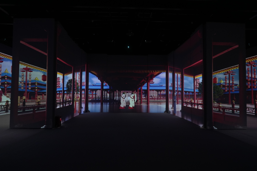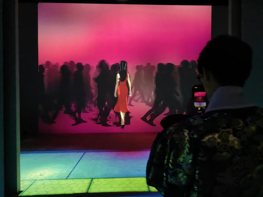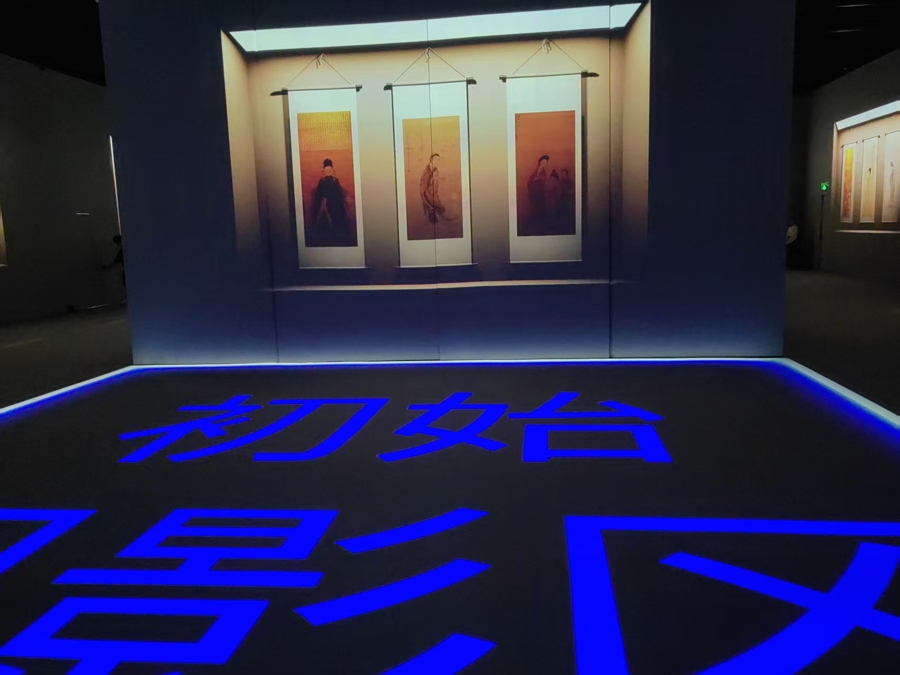 “丽人行——中国历代女性图像数字艺术展”由浙江省博物馆主办,为观众呈现全球40余家博物馆关于中国古代女性图像的研究成果。整个展览以光影艺术去重新创作和演绎文物之美,700平方米的“白盒子”展厅空间如同被银幕包裹的立体影院,根据现场提示站在“初始观影区”,就可以欣赏15分钟美术电影短片《无界》。放映时,眼前、四周,甚至地面上都会有影像出现。这边窈窕淑女翩翩起舞,那边灯后人影绰约呼之欲出,给人一种目不暇接的感觉。中间的展墙装置会随着剧情“开门”或者关闭,带来立体变换效果,演绎到宏大场面时,画面一直铺展到脚下,视觉之沉浸震撼,任何一家传统影院都难以比拟。