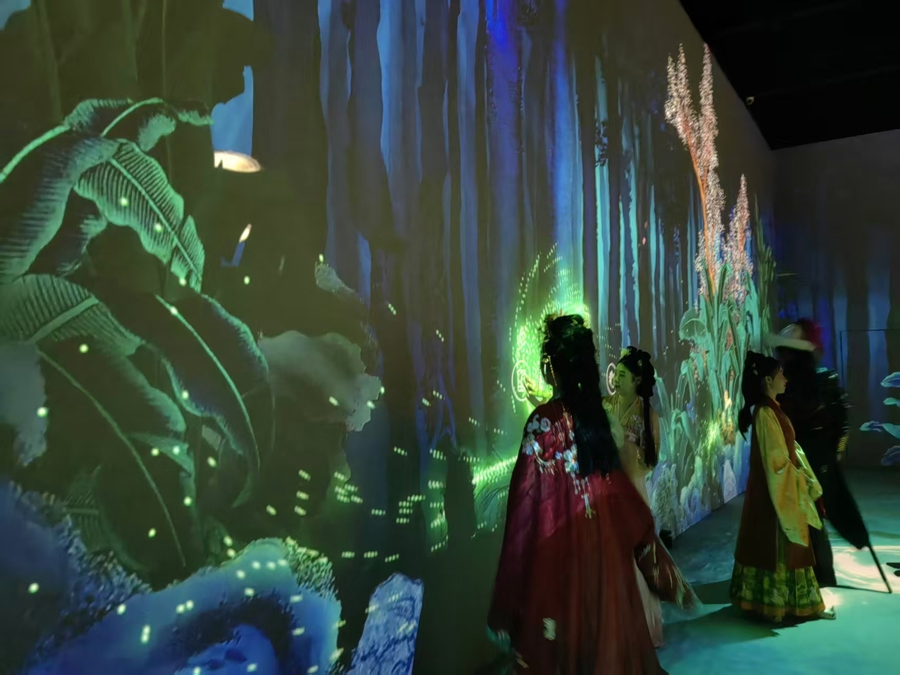 在《探秘》互动场景探索环节中,千余幅中国古代女性图像被归纳为“在郊野”“在庭院”“在闺房”三个主要生活场景:观众可指尖轻触暗夜中的荷叶,引得流萤追逐嬉戏;亦可漫步其间,看着地面随之荡开层层涟漪;扫描墙上的小程序,就可以了解图像背后的文物故事。