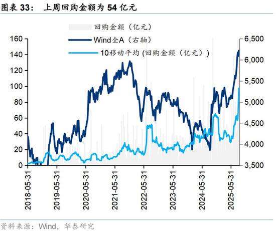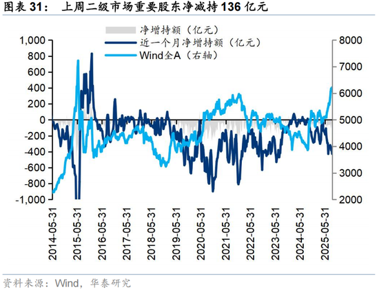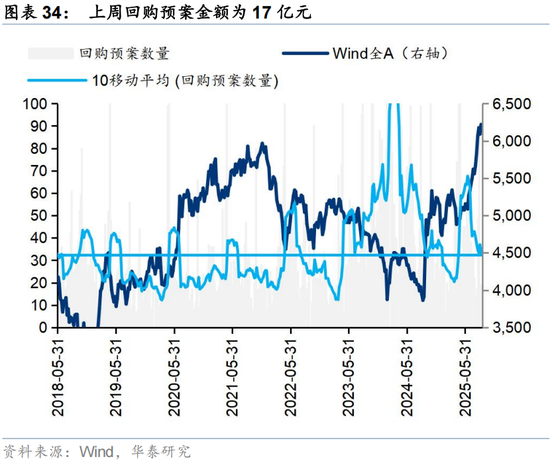上周二级市场重要股东净减持136亿元。解禁市值方面,本周解禁市值891亿元,供给端压力环比回升。回购方面,上周二级市场股票回购金额54亿元,回购预案金额为17亿元,回购金额环比前期小幅回落。