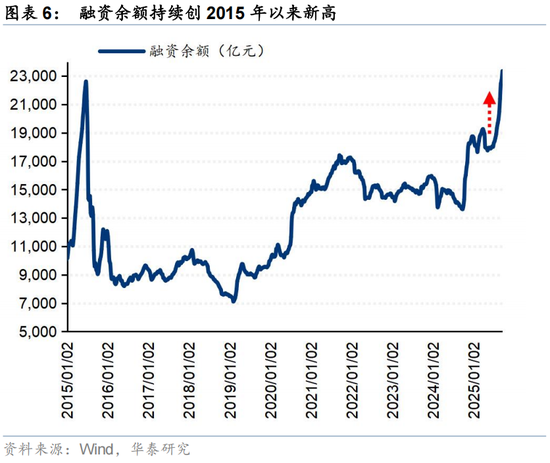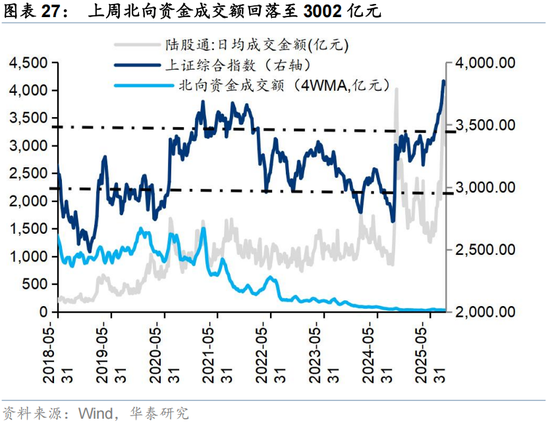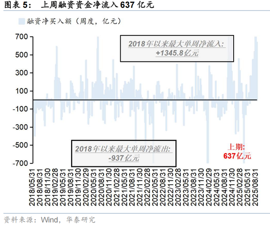 上周市场缩量收涨,参与交易的投资者数量中枢回落至7月底左右水平,交易型资金是市场的主要增量:1)有融资融券负债的投资者数量持续创新高,融资入市意愿仍偏强;2)上周融资净流入超600亿元,融资活跃度边际上行至11.6%,创2016年以来新高,方向上,融资资金持续布局电力设备,边际提升TMT仓位;3)龙虎榜指数成交额占比边际回落,但买卖额绝对值仍在2025年以来高位。
