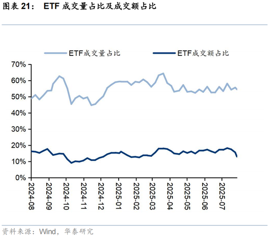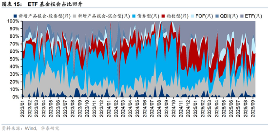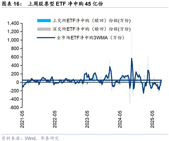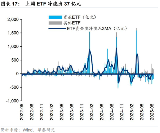 上周股票型ETF净申购45亿份,净流出37亿元,其中宽基ETF净流出191亿元,净流出有所收缩。分板块来看,大金融、高端制造板块净流入规模居前,行业中非银行金融、电力设备及新能源、医药等行业净流入居前。7月中旬以来场内ETF成交额中枢提升至2000亿元,相比25H1(1000亿元)有所回升。