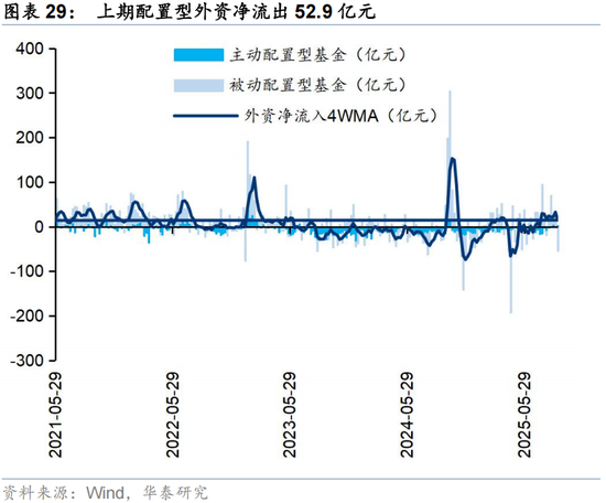 外资:以EPFR统计的配置型外资中,9月4日-9月10日,配置型外资净流出52.9亿元,其中主动配置型外资持续净流入1.1亿元,环比下降,被动配置型外资持续净流出54亿元;