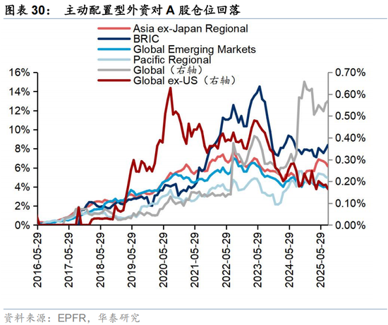 上周北向资金日均交易额回落至3002亿元。以EPFR统计的配置型外资中,2025.09.04-2025.09.10,配置型外资转向净流出52.9亿元,其中主动配置型外资持续净流入1.1亿元,被动配置型外资持续净流出54.0亿元,环比下降。截至8月初,各类主动配置型外资对A股仓位均有回落,仍有一定加仓空间。