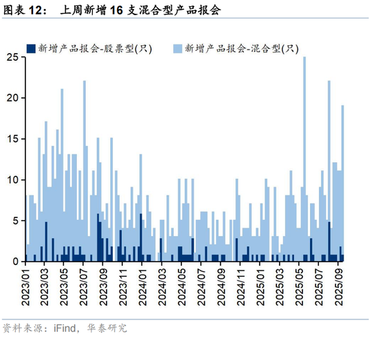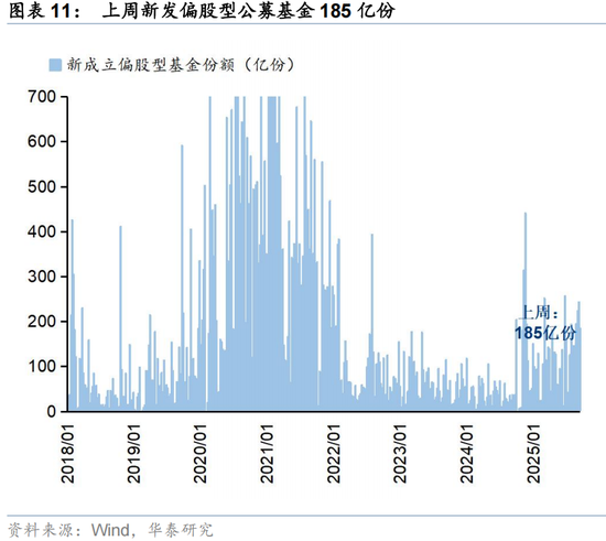 上周新成立偏股型基金185亿份,新发强度小幅回落,存量基金中,股票/混合基金权益仓位环比小幅回落。