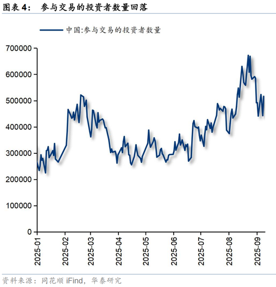 上周A股缩量震荡后收涨,创2024年以来新高,市场关注目前资金交易活跃度水平,我们观察到上周参与交易的投资者数量中枢回落至7月底左右水平,结构上来看交易型资金持续活跃,配置型基金仓位小幅回落,具体来看:1)融资活跃度边际上行至11.6%,创2016年以来新高,龙虎榜买卖额绝对值仍在2025年以来高位;2)存量公募基金仓位上周有所回落,以EPFR统计的配置型外资转向净流出。但亮点在于,主动配置型外资持续四周净流入,偏股型公募基金新发中枢份额持续回升,且在公募费改政策优化下,投资者长期持有的意愿或有所上行。
