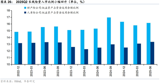 险资入市比例回升。截至2025Q2,财产险公司中权益资产占资金运用比例为16.16%,环比25Q1 15.80%小幅回升,人身险公司中权益资产占资金运用比例为13.34%,较 25Q1小幅回升。